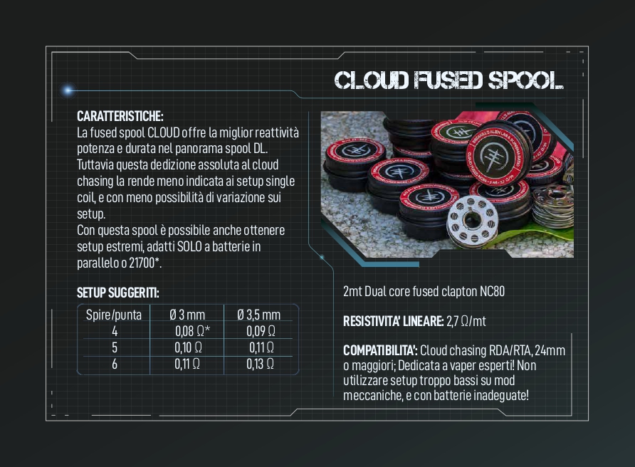 La fused spool CLOUD offre la miglior reattività potenza e durata nel panorama spool DL. Tuttavia questa dedizione assoluta al cloud chasing la rende meno indicata ai setup single coil, e con meno possibilità di variazione sui setup. Con questa spool è possibile anche ottenere setup estremi, adatti SOLO a batterie in parallelo o 21700*.