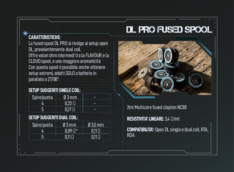 La fused spool DL PRO si rivolge ai setup open DL, prevalentemente dual coil. Offre valori ohm intermedi tra la FLAVOUR e la CLOUD spool, e una maggiore aromaticità Con questa spool è possibile anche ottenere setup estremi, adatti SOLO a batterie in parallelo o 21700*.