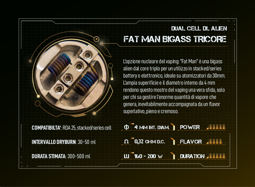 COMPATIBILTA’: RTA/RDA single/dual coil INTERVALLO DRYBURN: 25-30 ml DURATA STIMATA: 250-400 ml