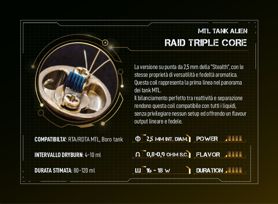 La versione su punta da 2,5 mm della “Stealth”, con le stesse proprietà di versatilità e fedeltà aromatica. Questa coil rappresenta la prima linea nel panorama dei tank MTL. Il bilanciamento perfetto tra reattività e separazione rendono questa coil compatibile con tutti i liquidi, senza privilegiare nessun setup ed offrendo un flavour output lineare e fedele.