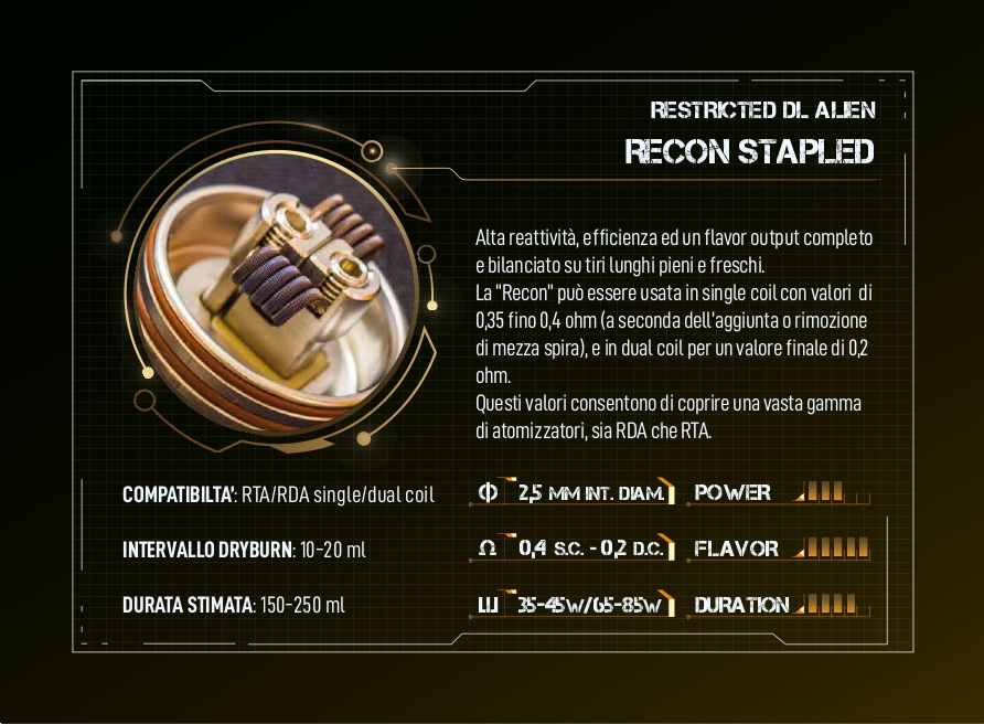 Alta reattività, efficienza ed un flavor output completo e bilanciato su tiri lunghi pieni e freschi. La “Recon” può essere usata in single coil con valori di 0,35 fino 0,4 ohm (a seconda dell’aggiunta o rimozione di mezza spira), e in dual coil per un valore finale di 0,2 ohm. Questi valori consentono di coprire una vasta gamma di atomizzatori, sia RDA che RTA.